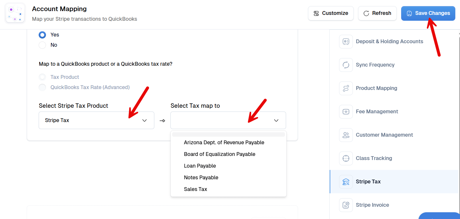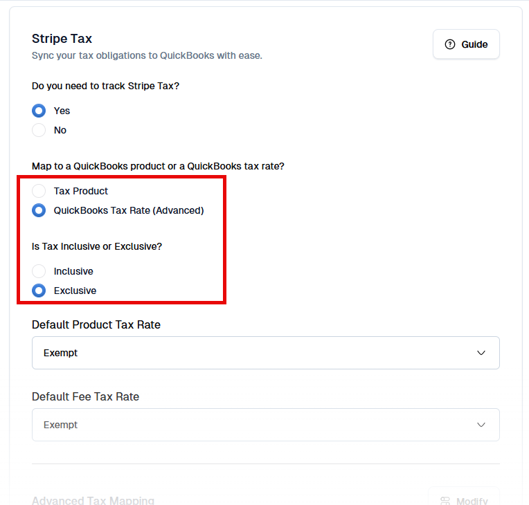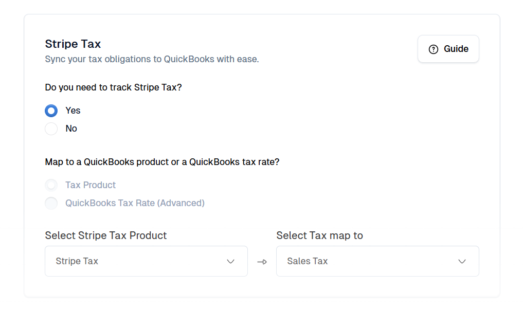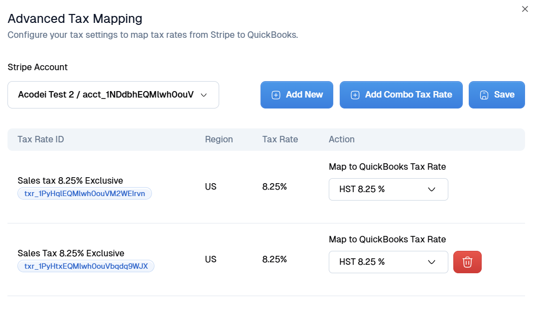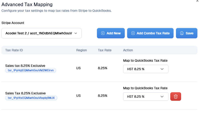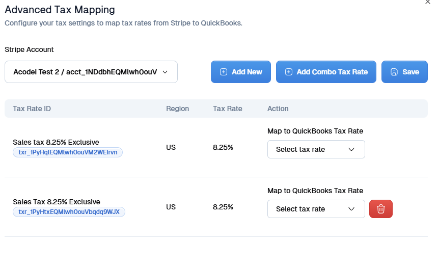 Each Stripe Tax Rate (e.g., VAT, GST) can be mapped to the correct QuickBooks tax code.