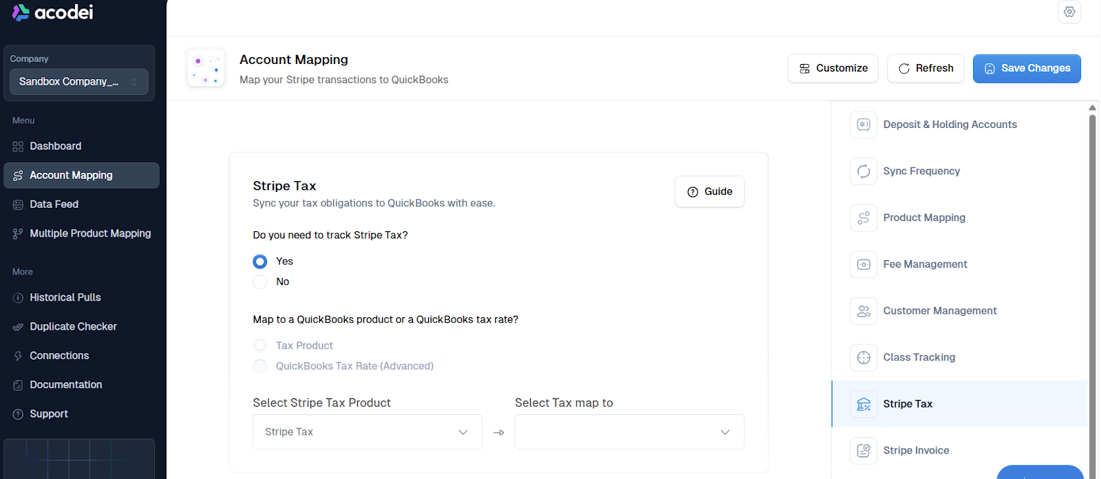 Acodei integrates with Stripe Tax to keep your QuickBooks sales tax records accurate. With Stripe Tax enabled, Acodei will automatically sync calculated taxes from Stripe into QuickBooks so you can easily track what you’ve collected and stay compliant.